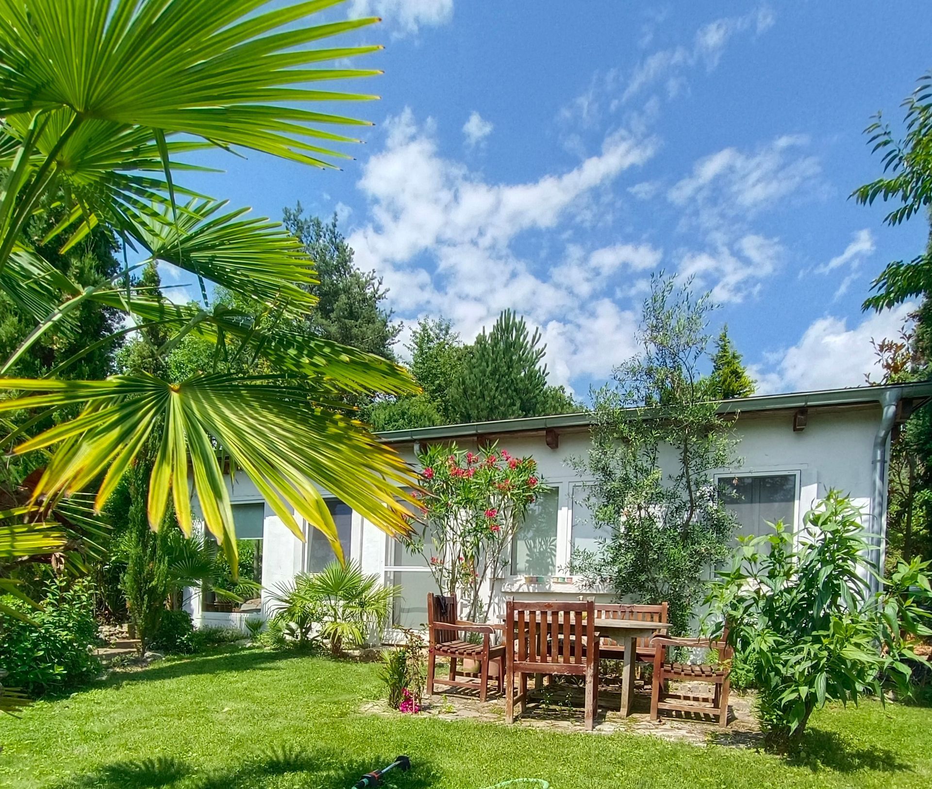Großräumig dem illyrischen Klima - also bereits submediterran- untergeordnet, liegt der mediterran angelegte Garten auf einem langgezogenen Südwesthang. Im zusätzlich milden und gegen Norden und Osten geschützten Mikroklima gedeihen Pflanzen aus dem mediterranen Raum wie man es in Mitteleuropa anderswo nur schwer finden wird. Ausser einem alten Weingarten mit der für die Region Südburgenland so bekannten Sorte Uhudler bestand das Hanggrundstück zum Zeitpunkt meines Erwerbes nur aus Wiese. Die Bepflanzung begann 2006 mit einem Feigenbaum und umfasst mittlerweile circa 300 Exoten.